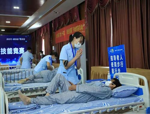 保育师项目决赛中,选手们动作轻柔且技巧娴熟规范,每一个环节的基本功都非常稳定扎实。养老护理员项目中参赛选手们凭借熟练的护理技术,借助相应的护理设备,动作协调地从生活照料、技术护理、康复护理等方面展示养老护理技能,每一个环节都用温馨的语言进行沟通。